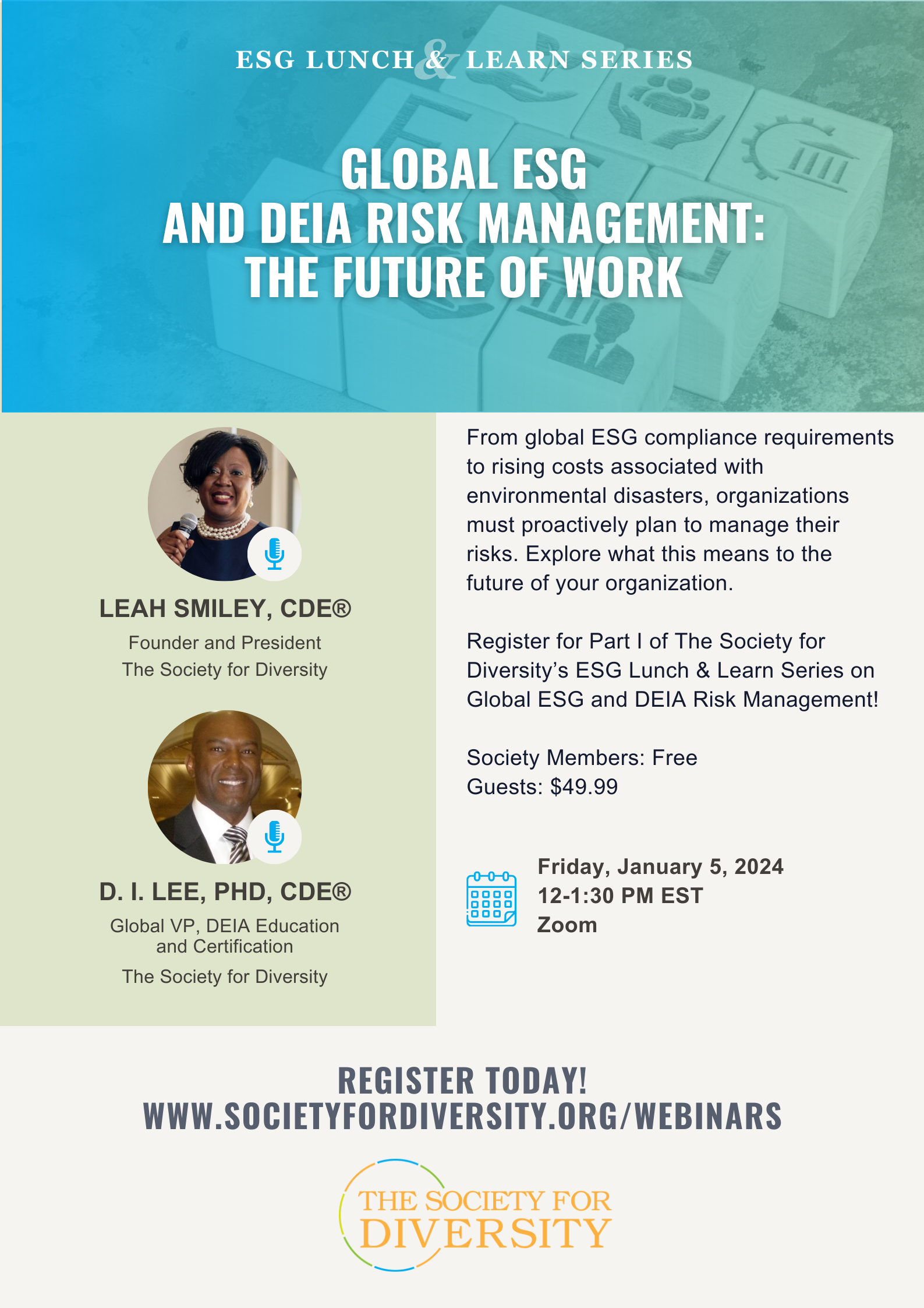 From global ESG compliance requirements to rising costs associated with environmental disasters, organizations must proactively plan to manage their risks. The Society for Diversity's Leah Smiley, CDE, and Dr. Delmar Lee, CDE, will explore what these topics mean to the future of your organization: